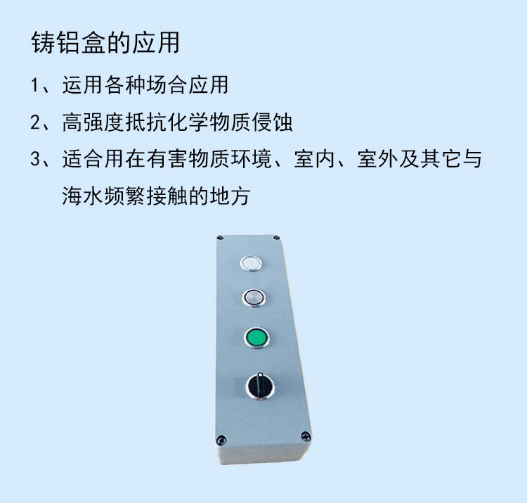 LV系列铸铝盒采用高质量压铸铝合金压铸而成。具有结构合理简洁、优秀的抗冲击性能、有效的密封性能和良好的抗电磁干扰的特点。可安装接线端子盒线路板或其它电气元件,适用于各种自动化领域。