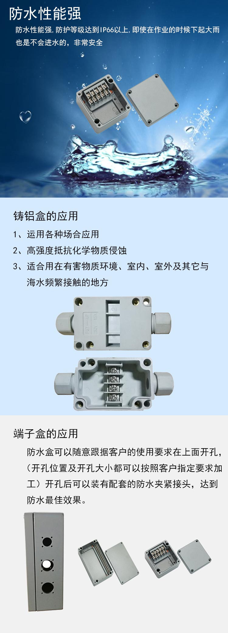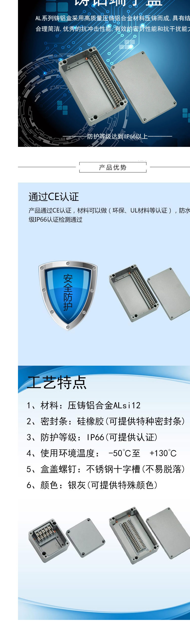 LV系列铸铝盒采用高质量压铸铝合金压铸而成。具有结构合理简洁、优秀的抗冲击性能、有效的密封性能和良好的抗电磁干扰的特点。可安装接线端子盒线路板或其它电气元件,适用于各种自动化领域。