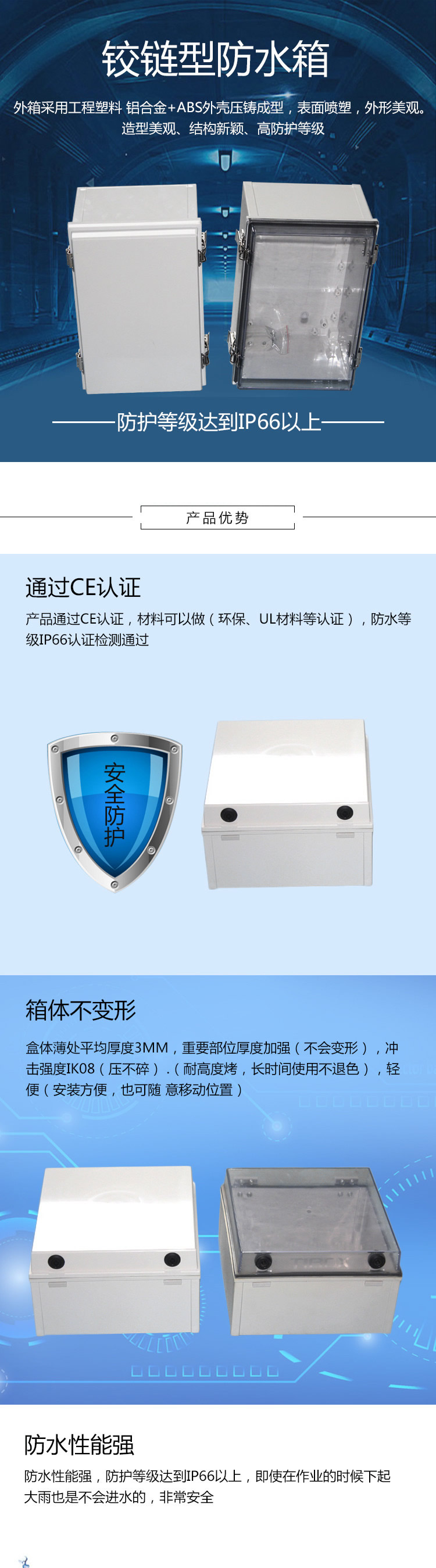 3.箱体厚度:盒体最薄处平均厚度3mm,重要部位厚度加强(不会变形),冲击强度IK08(压不碎) ;轻便(安装方便,也可随 意移动位置)。